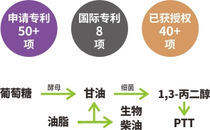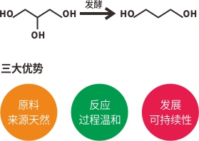 微生物发酵法PDO生产工艺操作简单,反应过程温和,原料为可再生资源,且价格低廉,生产成本低;可与生物柴油产业耦合,使用生物柴油副产甘油生产PDO。